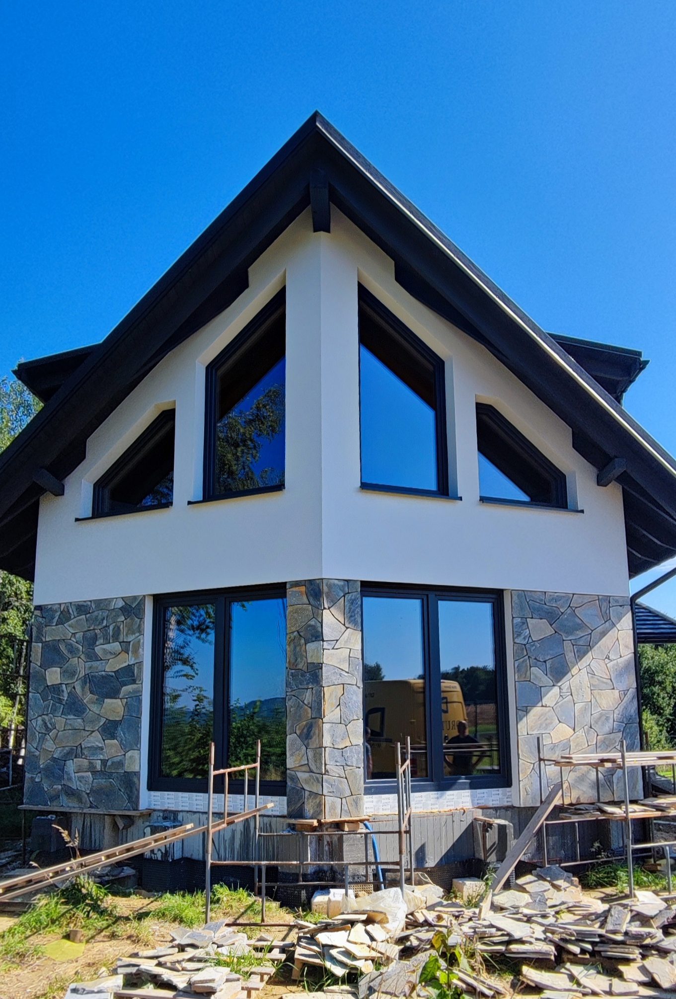 Jedna z naszych ostatnich realizacji pod Strzyżowem. Ciekawy projekt domu z oknami skośnymi. -Okna IGLO ENERGY CLASSIC z firmy Drutex (montaż na ciepłych parapetach) -Rolety …