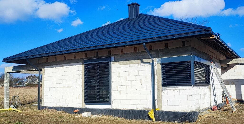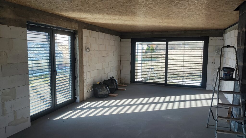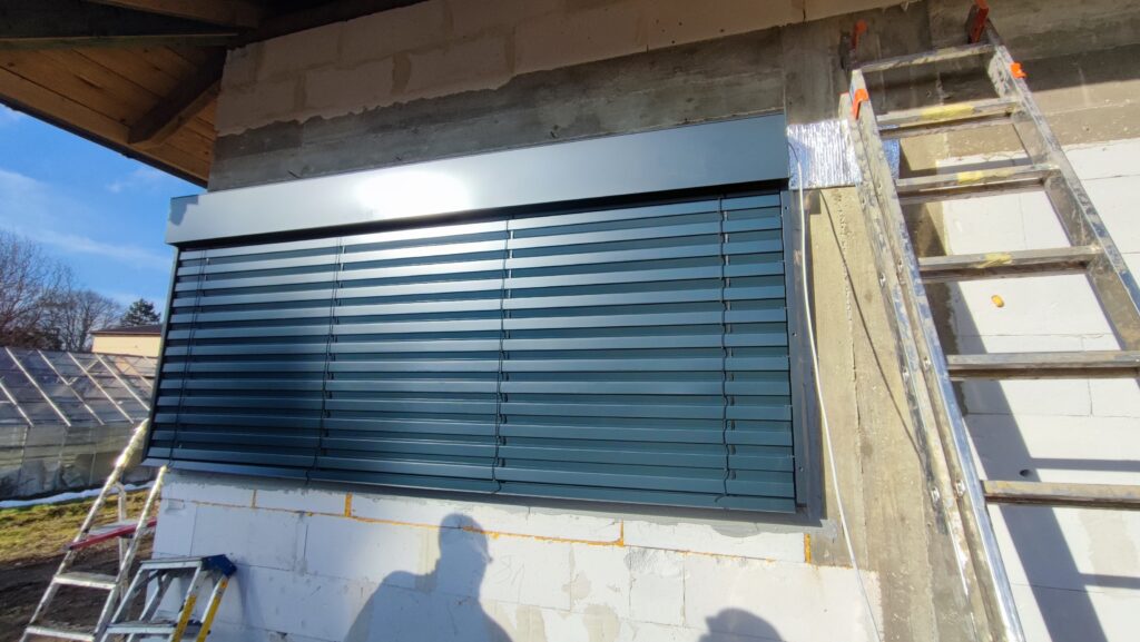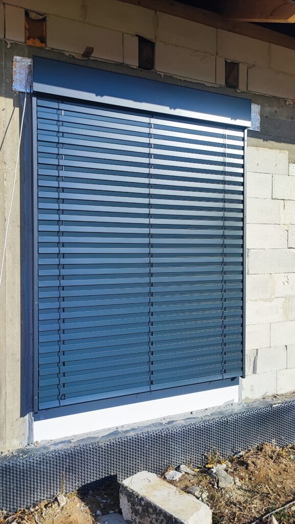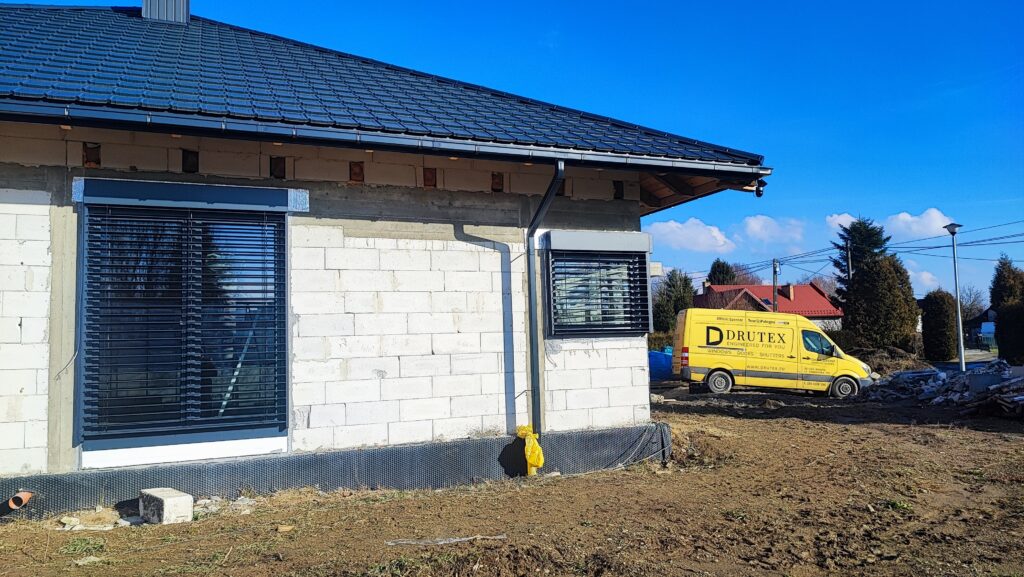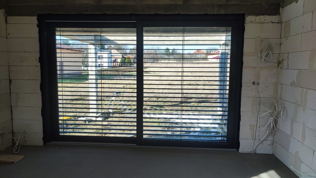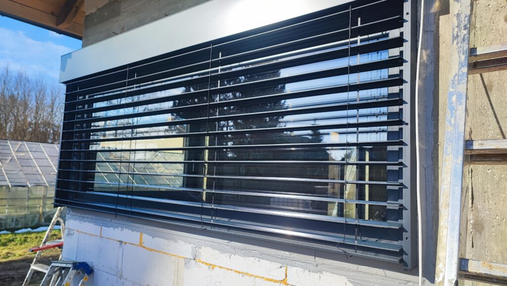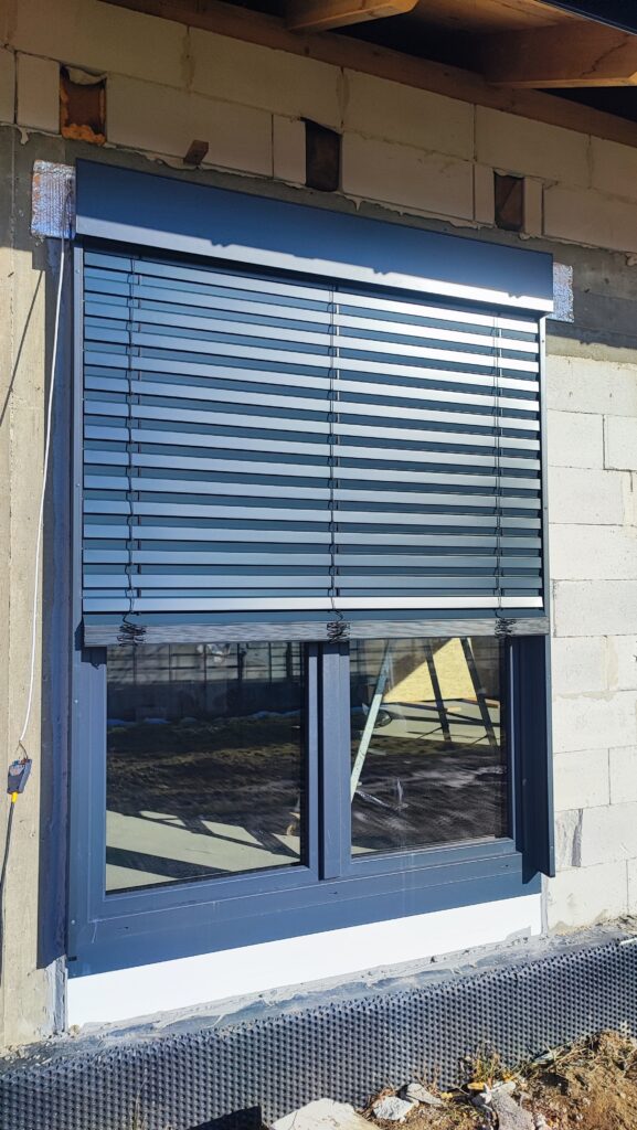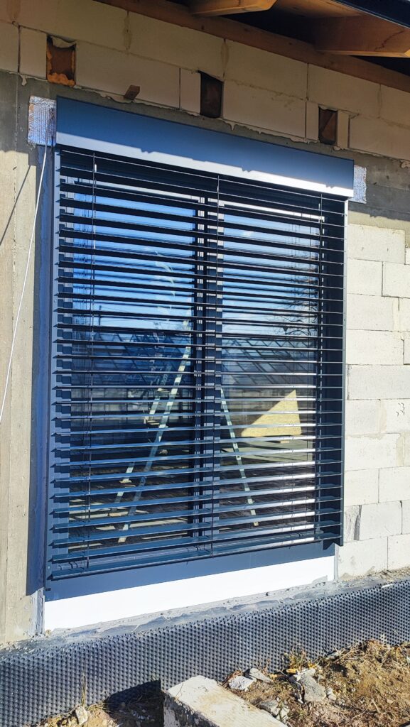 – Żaluzje fasadowe podtynkowe z lamelami o profilu “Z” w kolorze RAL7016. Docieplenie nadproży matą aluthermo oraz podłączenie z możliwością sterowania kątem nachylenia żaluzji.